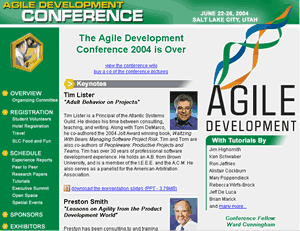 ■ 名称:アジャイル開発カンファレンス2004 (Agile Development Conference 2004) ■ Web: http://www.agiledevelopmentconference.com ■ 期日:2004年6月22日~26日 ■ 場所:米国ユタ州、ソルトレイクシティ |