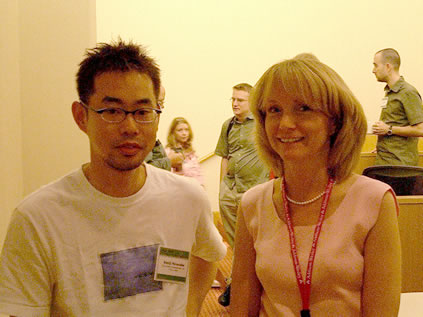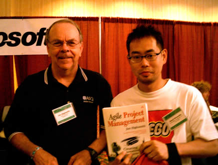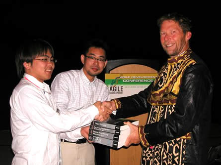 すべてのアンチプラクティスを、この「ストーリー/アクション/アフター/結晶化」という枠組みに沿って発表しています。 そして、このストーリーを日本人3名の「寸劇」として観衆の前で発表しました。 そうしたところ、このマンガ によるスライドと寸劇の評判がすこぶるよく、会期中にあちこちで話題になっているのを耳にしました。 「あの日本人の発表はワンダフルだった!あのスライドは見るべきだよ!」 こんな噂がたち、「ああ、君たちのスライドはすごかったらしいね!」と毎晩声を掛けられました。 そして、最終日、私たちの論文は「ベストプレゼンテーション賞」を受賞することになりました 。 ![]() Alistairからベストプレゼンテーション賞を受ける倉貫さんと筆者 まとめ6日間にわたる会議で感じたのは、各国から集まっているエンジニアたちの、現状ソフトウェア開発の現場を変えようとする強い思いでした。 一緒に外出したり、お酒を飲んだりして、実に多くの人といろんな会話をしました。 話題は、宗教・哲学・戦争・生活・恋愛・家庭・エンジニアリング・科学などを行ったり来たりしながら、中心はいつも「アジャイル」でした。 一つのキーワードを中心にして、国や文化を超えたコミュニティがしっかり出来上がりつつあることを実感した一週間でした。 このような新しいムーブメントが産業界でのインパクトを持つには、やはり個人と個人のつながり、「ソーシャルネットワーク」が重要なのです。 このカンファレンスは、教室の中で行なわれた会話よりも教室の外で行なわれた会話の方が重要だった、と参加者は口をそろえて言います。 そういった場作りの重要性、そう、「ファシリテーション」こそがアジャイルの1つのポイントなのでしょう。 残念なことに、このカンファレンスは今年で終了です。 今年はアメリカでアジャイルカンファレンスが2つ催されました。 一つは私がレポートした「Agile Development Conference」、もう1つは、「XP/Agile Universe」です。 来年に向けて、この2つは合併します。現在その名前を募集中とのことです。 最後に、私と一緒にカンファレンスに出席した、倉貫義人さん、中井正幹さん、どうもありがとうございました。 来年もまた行けますように。 以上。 | |||||||||||||||||||