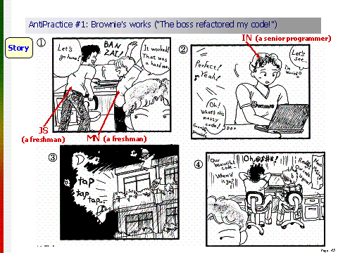 経験論文(Experience Report)自らの体験を語る経験論文(Experience Report)では、多くの活発な発表がありました。 実は日本からも、1つ論文発表がありました。 ここでは、倉貫義人さん(TIS株式会社)と私が共同で発表した論文を紹介します。 私たちの発表は、 「アンチプラクティス:XPプロジェクトのアンチパターン」 という題名で、XPを導入したプロジェクトでよく起こる問題と、その対処法を対にしたものを「アンチプラクティス」と呼び、これを普及させようというものです 。 XPを導入した初期のころはうまくいっても、XPの極端なプラクティスのせいでチームの状態が悪くなることがあります。 日本には「過ぎたるは及ばざるが如し」という諺があります。 よい状態を保つには、この悪い状態(アンチプラクティス)を解決しながら、XPを自分たち独自のプロセスへと成長させていかなければなりません。 この過程は、「守破離」と似ています。 最初はXPの教えを忠実に守る。 次に、それを破ってみる。アンチプラクティスは、この破の状態に対する道しるべです。 ここでは、そのアンチプラクティスの1つである、Brownie’s Works: The Boss Refactored My Code!”(邦題:ブラウニーズワーク~作ったところがなくなった!)を紹介しましょう。 ![]() XPアンチプラクティス1 - Brownie’s Works