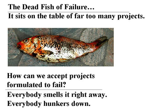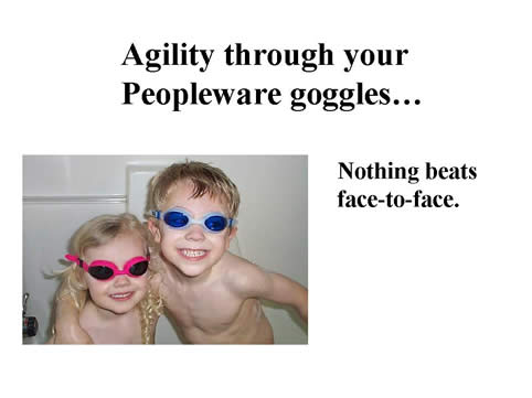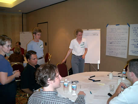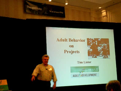 プログラムカンファレンスのプログラムは、以下のようなセッションから構成されます。 ■ アイス・ブレイカー・パーティ(Ice Breaker Party) … 前日の顔合わせパーティ■ 基調講演(Keynotes) … 会議の基調を設定する主賓講演 ■ チュートリアル(Tutorial) … 既に確立されたテーマの講義 ■ 研究論文(Research Papers) … 研究的な論文 ■ 経験論文 (Experience Report) …体験レポート ■ ピア・トゥ・ピア(Peer To Peer) … 小グループによる相互議論のセッション ■ オープンスペース(Open Space) … 自立的に始まる討論会 ■ ゲッタウェイ(Getaway) … 外へおでかけ! このカンファレンスの特徴は、「チュートリアル」や「研究論文」だけでなく、より参加型の「ピア・トゥ・ピア」や「オープンスペース」とよばれるワークショップ形式が多く含まれていることです。 これらのおもしろい形式のセッションについては後述しましょう。 また、アイス・ブレイカー・パーティや、ゲッタウェイといった、カンファレンスの本筋ではないけれど、人と食事や会話をしながら対話を楽しむことによって、ソーシャルネットワークを形成する仕組みも盛り込まれています。 このカンファレンス全体が、一つの「参加型、自己組織型コミュニティ」としてファシリテート されているのです。 アイス・ブレイカー・パーティ(Ice Breaker Party)カンファレンス前日の夜には、「アイス・ブレイカー・パーティ(Ice Breaker Party)」が催されました。 アイス・ブレイキングとは、「初対面の緊張を割る」ことです。簡単な食事とドリンクでの立食パーティで、会場にはダンサー、占い師、曲芸師、似顔絵師、などなどが飛び入りするという面白い趣向がほどこされていました。 参加者たちはまずこのパーティに参加し、カンファレンス全体の雰囲気を知り、旧知の友と握手をし、友人を紹介し合い、初対面の人と話をし、緊張と時差ボケを解いてリラックスします。 このカンファレンス全体が参加型としてデザインされているため、参加者は自ら発言したり、他の参加者とコミュニケーションを採ることが求められます。 このパーティによって、次の日からはじまるカンファレンスへ積極的に参加する勇気を得ることができるのです。 著者の似顔絵 ナイフ投げとかの写真を入れる基調講演(Keynotes)キーノートスピーチ(基調講演)は、『ピープルウェア』『熊とワルツを』の著者(Tom Demarco氏と共著)として知られるTim Lister氏と、ソフトウェア以外の工業製品開発でアジャイルを先導しているPreston Smith氏。 Tim Lister氏は、”Adult Behavior in Projects” (『プロジェクトにおける「大人の行動」とは?』) という題名で、ソフトウェアプロジェクトにおける「アジャイル」の意味を、「リスク管理」と「ピープルウェア」の視点から語りました。 ![]() Tim Lister 氏の基調講演 ”Adult Behavior on Projects” ![]() Preston Smith氏の基調講演 ”Lessons on Agility from the Product Development World” Lister氏は、著書『熊とワルツを』でリスク管理を、『ピープルウェア』でソフトウェア開発の人間系の視点を扱っています。 ここでは、Tim Lister氏の講演から、3つのスライドとその論点を紹介します 。 ● リスクとプロジェクト管理![]() 『リスク管理』の観点から、ソフトウェアプロジェクトの進捗は、ハリケーンの進路のようなもの。 元来計画どおりには進まないのだ。 しかし、多くの管理者は、ソフトウェアプロジェクトが計画に沿うように管理できると考えている。 過去のプロジェクトの成功率を見てみれば、そうではないことが明らかなのに、どうしてプロジェクトは計画通りに行かない、ということを受け入れられないのだろうか。 ハリケーンの進路が、不安定であり、数時間後の位置が予測できない、ということは受け入れるのに…。 ● デッド・フィッシュ![]() 悪い兆候のプロジェクトのテーブルには、「デッド・フィッシュ」(死んだ魚)が横たわっている。 「このプロジェクトはうまく行かない」という匂いがぷんぷんしている。 そして、プロジェクトに関わる全員がみんな、みんなデッド・フィッシュの匂いに気づいているのに、目をそらして知らないふりをする。 勇気をもって、誰かが、「デッド・フィッシュがそこにいる!」といわなければならない。 みんな分かっているはずだ。 ● ピープルウェア![]() そして最後は、『ピープルウェア』の観点から、フェイス・トゥ・フェイスのコミュニケーションの重要さ、楽しく仕事をすることの大切さを強調してしめくくりました。 氏の言葉、「Nothing beats face-to-face.(フェイス・トゥ・フェイスに勝るものはない)」は、このカンファレンスで私が最も感銘を受けた言葉となりました。 ピア・トゥ・ピア(Peer to Peer)とオープンスペース(Open Space)「ピア・トゥ・ピア(Peer to Peer)」という形式のセッションでは、オーガナイザー(進行役)が準備した進行に沿って、参加者が議論をし、そこで学んだことを共有します。 写真は、「Agile Tester」というピア・トゥ・ピアの様子です