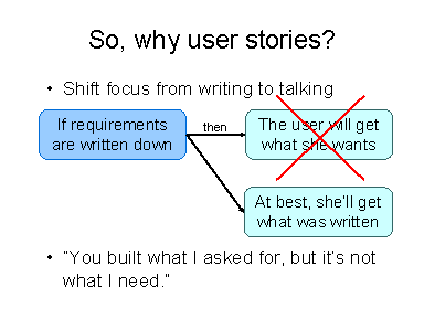 原則 7 全体を見る ● Large Scale Agile Software Developmentアジャイルな開発手法はこれまで、少人数のチームにしか適用できないことが大きな問題でした。 Ron Crockerは、これをどのようにスケーラブルにするか、というテーマを扱っています。 ![]() Ron Crockerの『Large-Scale Agile Software Development』 ![]() XPのプラクティスの中でスケーラブルなものとそうでないもの ![]() XPプラクティスに対する補完 彼は、まずXPのプラクティスの中でスケーラブルなものを取り出し、そして、そうでないものと区別しています。 さらに、スケーラブルでないものを補完する形で別のプラクティス(これをGrizzlyと呼ぶ)を足しています。 ● User Stories AppliedMike Cohnは、ユーザストーリ書き方に焦点をあてています。 これは、過去にAlistair Cockburnが著書『ユースケース実践ガイド:効果的なユースケースの書き方』で、よいユースケースの書き方に焦点をあてたのと同様、アジャイル開発でも、よいストーリーを書くことが本質的に難しいからです。 ![]() Mike Cohn 著、『User Stories Applied: For Agile Software Development』 このチュートリアルの中でMikeは、ユーザストーリが「書くこと」から「話すこと」への価値感の転換がもっとも重要だとしています。 仕様書を書くと、「書いたものが得られる」、と考えると間違いで、「よくても書いたものしか得られない」と考えるべきです。 書くということではなく、人間はフェイス・トゥ・フェイスで「話す」ことによって、より多くの情報を得られます。 簡潔にしか書かないことで、この「話す」というブロードバンドな活動の方に焦点を移すことが、ユーザストーリの本質的な役割なのです。 ![]() 「書くこと」から「話すこと」へのシフト そして、Mikeはよいストーリーの条件を見つけ出そうとしています。よいストーリーは、 ■ Independent - 独立している■ Negotiable - 交渉可能である ■ Valuable - ビジネス価値がある ■ Estimatable - 見積もりができる ■ Small - サイズが小さい ■ Testable - テスト可能である という特性を持っています。 これらの「良いストーリーの条件」は、頭文字を取って、「INVEST」と名づけられています 。 研究論文(Research Paper)研究論文では、著書『ペアプログラミング』で有名なLaurie Williamsらの2つの論文を紹介しましょう。 彼女は、今回2つの論文を発表しました。