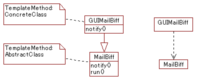 とあります.今回の例では,全体の処理の流れを規定するrun()メソッドが上 記の「スケルトン」に当たります.また,youGotMailPopup()が「いくつかの ステップ」に当てはまります. TemplateMethod パターンを使った解決は次のようなものです. まず自分でMailBiffクラスを書き,youGotMailPopup()を空にしておきます. youGotMailPopup()担当者はMailBiffを継承してGUIMailBiffという新たなクラ スを作り,youGotMailPopup()をオーバーライドして実装します.あたなたは 最初,youGotMailPopup()メソッドに簡単な1行のプリント文入れることで,自 分の POP3プロトコルでのメールチェックの部分に専念してテストができます. GUI実装者はMailBiffを継承してyouGotMailPopup()をオーバーライドしたクラ スを作ることで,GUI部分を実装します. 第2バージョンのプログラムは次のような2つのクラスになるでしょう.