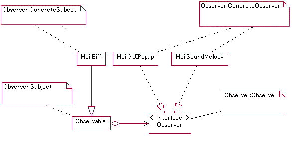 MailBiffが変更通知側です.よってObservableを継承します. Observableクラスには,あらかじめnotifyObservers()メソッドが準備されています. また,自分自身の状態が変化したことをマークするsetChanged()メソッドがあります. notifyObservers()の中ではObserbableに登録されている 全Observableに通知を送る機能が用意されています. 通知を受け取るクラスは,次のように実装します.