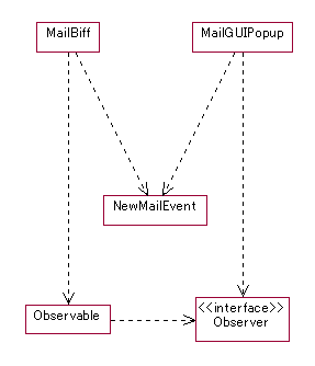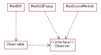 これで複数の通知希望者に対して,同時にメールが着信したという通知を送る ことができました.また通知先はaddObserverメソッドによって登録するため, ランタイムに変更することも可能です. また,MailGUIPopupやMailSoundMelodyクラスは,もはやMailBiffに依存して いません.MailGUIPopupクラスおよびMailSoundMelodyクラスの実装者は, MailBiffクラスの実装を待たずに実装を始めることができます.クラス図上で は,依存関係が両者から消えています.これは,MailBiffクラスと MailGUIPopupおよびMailSoundMelodyクラスとの間の通知インターフェイスが, ObserverとObservableに押し出され,局所化されてしまったからです. これで,懸案の問題は一応すべて解決したようです. |