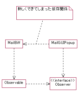 新たな要求を考えてみます.新着メールのポップアップの表示は,「新着メー ルです!」という単純なものを考えていましたが,差出人や表題を含めて「新 着メールです!差出人:○○,題名:○○」というポップアップを出して欲し い,という要望が出ました.MailGUIPopupはこの通知を行うためにMailBiffか らメールの差出人と題名に関する情報を受け取る必要があります.Observerパ ターンでは,タイミングの通知を主に置いているため,それ以上の情報を受け 渡すには工夫がいります.この問題に対処するには伝統的に2つの手法があり ます.