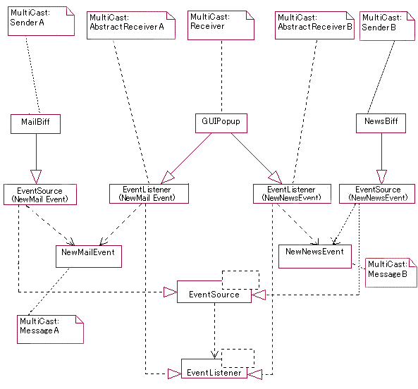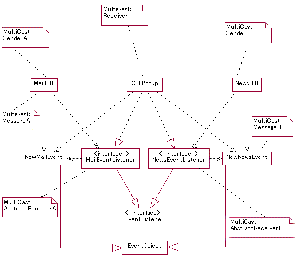 これも,意味は C++ バージョンと全く同じです. イベントオブジェクトは,全述の NewMailEvent と NewNewsEvent をそのまま利用します. では,メールビフとニュースビフをこれらを使って実装してみましょう. |