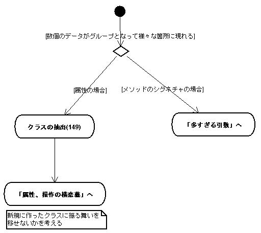 データの群れ(81)数個のデータがグループとなって、クラスのフィールドやメソッドのシグネチャなど、さまざまな箇所に現れることがあります。こうした群れをなしたデータは、オブジェクトとして1箇 所にまとめるべきです。 ![]() |