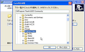 1-4-4 インストールダウンロードが完了したら、そのファイルをダブルクリックすることでインストーラが起動しますので、 インストール先のフォルダなどを指定するだけです。 ![]() Windows98、MEの場合は、Setupプログラム完了後、 JUDEインストール先フォルダにあるjude.batを編集して、 JUDE_HOME変数にそのフォルダの絶対パスを設定してください。 | ||||||||