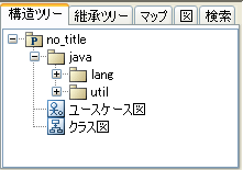 1-5-2 新規プロジェクトを作成するJUDEでは、UMLのデータをプロジェクトというxxx.judeファイルに保存します。 起動後は何もプロジェクトを開いていませんので、まず新規のプロジェクトを作成します。 【ファイル】メニューの【プロジェクトの新規作成】を選択します。構造ツリーとプロパティビューが表示されます。 新規のプロジェクトは、構造ツリーに表示されているように、次のデータを保持しています。 ![]() "no_title"の配下に空のユースケース図とクラス図を保持しています。 javaパッケージは、JavaプラットフォームAPIに対応するもので、 "String"や"Vector"といった一部の基本的なクラスが含まれています。 これらのクラスは、属性の型などに使用できるようになっています。 | ||||||||||||||||||