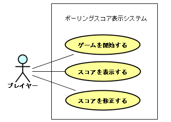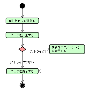 つぎに"スコアを表示する"ユースケースについて処理の流れを描いてみましょう。 アクティビティ図をプロジェクトに追加します。 構造ツリー上で"スコアを表示する"ユースケースのポップアップメニューから、【アクティビティ図の追加】を選択します。 アクティビティ図が追加され、その図がダイアグラムエディタで表示されます。 ![]() ユースケース図の時と同様に、図の名前を変更しておきましょう。 "スコア表示の動作"という名前にしておきましょう。 アクティビティ図のツールバーには、次のボタンが並んでいます。 ![]() それでは、次のアクティビティ図を描きましょう。 ![]() アクティビティ図は、フローチャート図に近い図で動作の流れを表現しますので、わかりやすいですね。 この図では、プレイヤーが投球後、スコア表示が更新されるまでの処理手順がかかれています。 特にストライクのときのみ特別なアニメーションを表示することがわかります。 まず矢印線以外の開始状態、終了状態、アクション状態を作成していきましょう。 作成方法は、アクターやユースケースの作成方法と同様で、 それぞれのモードにして作成したい位置をクリックするだけです。 アクション状態に設定するアクション(entryアクション)は、図上で編集するかプロパティビューで編集します。 |