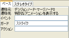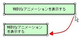 リサイズ"特別なアニメーションを表示する"アクション状態は、1行だと長いのでサイズを変更して折り返してみましょう。 サイズ変更は、アイテムの外枠を選択後、四隅に表示されるノブをドラッグして行います。 ![]() 菱形の選択アイテムについては、同じ形の連結アイテムと間違えないように注意して作成します。 さて、動作の流れを表す矢印で各アイテムをつないでいきましょう。この矢印は遷移です。 接続する二箇所をクリックしますが、今度はクリックする順序が違うと向きが逆になりますから注意します。 毎回モードを選択するのは面倒ですから、アイテムの連続作成に挑戦してみましょう。 |
