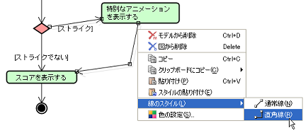 状況により直角線スタイルに変更するときれいになります。 今回のアクティビティ図では、すべて直角線スタイルに変更しておくとよいでしょう。 線を選択後ポップアップメニューから【線のスタイル】-【直角線】とします。 ![]() |