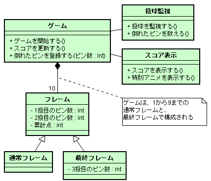 次はクラス図です。特にクラス図とシーケンス図は使用頻度が高い図なのでじっくり集中して説明します。 ![]() この図は、ボーリングゲームとスコアに注目して分析したクラス図です。 ゲームは10個のフレームで構成され通常のフレームは2投あるが、最終フレームは3投目をもつことが整理されています。 "分析クラス図"と名前をつけて作成しました。 クラス図のツールパレットには、次のボタンが並んでいます。![]() まず、大雑把にクラスを描いてから細かいところを描きましょう。全クラスを作成してみてください。 クラスの作成方法はアクターやユースケースと同様です。 下側の2本の線は、汎化です。汎化の作成時には、汎化元を先にクリックします。 下側にある2本の斜め線と破線以外は、関連です。その3本の関連を次に作成しましょう。 関連はユースケース図でも作成しました。 "ゲーム"クラスと"フレーム"クラス間の関連は、コンポジションになっています。 ゲームはフレームで構成され、ゲームがなくなればフレームもなくなるような関係を表現しています。 |