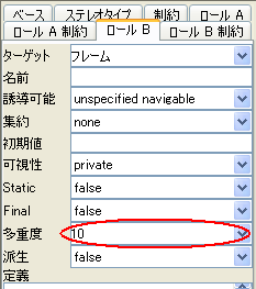 コンポジションをポップアップメニューから設定してみましょう。 ![]() 関連のポップアップメニューの表示位置で動作がかわります。 図のように関連の"ゲーム"クラス側でポップアップメニューを表示するとその端点に関する編集が可能です。 今度は、多重度をプロパティビューから設定してみましょう。 関連を選択するとプロパティビューが次のようになりますので多重度を設定しましょう。 ![]() ロールタブが二つの端点に対応して二つあるので、注意が必要です。 今は、ターゲットが"フレーム"となっている方(ロールB)のタブで多重度を10と設定します。 後はクラスの属性と操作の追加です。 |