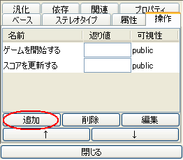 クラスの操作の追加操作に対する編集方法は、前の属性に対する編集方法と同様です。 ここでは、クラスのプロパティビューから作成してみましょう。 ![]() 【追加】ボタンで操作を追加します。追加した操作の名前などの編集は、 このテーブル上または、操作固有のプロパティビュー上で編集します。操作固有のプロパティビューでは、 パラメータの設定などのより詳細な設定が可能です。【削除】ボタンは、選択されている操作を削除します。 【編集】ボタンは、選択されている操作の固有プロパティビューを表示します。 【↑】ボタン【↓】ボタンは、選択されている操作の順序を変更します。 "倒れたピンを登録する"操作を追加できたら、パラメータ"ピン数 : int"を追加しましょう。 操作固有のプロパティビューを開き、パラメタタブで同様に追加します。 今までのところついてこれているでしょうか? JUDEを使って図を描いてみるのが目的ですから、細かいことは飛ばして次に進みましょう。 |