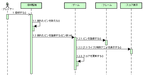 次はシーケンス図です。 "ゲーム"クラスがもつ"倒れたピンを登録する"操作を中心とした処理の流れを描いてみましょう。 シーケンス図は、構造ツリーにおいてユースケースの下や、操作の下に追加することができます。 "ゲーム"クラスがもつ"倒れたピンを登録する"操作のポップアップメニューを表示し、 【シーケンス図の追加】を選択してください。 ![]() この図は、"プレイヤー"がボーリングの玉を転がすと、"投球監視"オブジェクトがそれを認識し、 "ゲーム"オブジェクトに倒れたピン数を登録する、 そしてストライクなら"スコア表示"オブジェクトが特別なアニメを表示するといった処理の流れを表現しています。 アクティビティ図でも似たような処理の流れを描きましたが、 シーケンス図ではオブジェクト間のメッセージのやり取りを時系列で表現しています。 ![]() さて、今まで描いてきた図とは結構見た目が違いますね。 編集方法も多少違いますので気を抜かずに進めましょう。 まず図の上側に並んでいる5つのオブジェクトを描きましょう。 フライングで描き始めていた人は、ちょっと待ってください。 ツールパレットからもオブジェクトを作成できるのですが、構造ツリーを活用するのが便利です。 具体的には、構造ツリーからベースとなるクラスを図にドラッグ&ドロップすることでオブジェクトを作成します。 ![]() ドロップするとオブジェクトの名前が編集状態になります。 ここでは特にオブジェクトを区別しませんので省略しています。 この場合BackSpaseキーで名前を空にしてEnterを押します。 構造ツリーで複数のクラスを選択し、一度に図にドラッグすることも可能です。 次にメッセージを作成していきます。 "プレイヤー"から"投球監視"オブジェクトへのメッセージは、非同期メッセージになっています。 ツールパレットの左から4番目のボタンで、非同期メッセージ作成モードにしましょう。 後は、"プレイヤー"のライフライン上をクリックし、さらに"投球監視"のライフライン上をクリックすれば、 メッセージの矢印が引かれます。message0という名前を2回クリックして"投球する"に変更しましょう。 同じように続く"1.1:倒れたピンを数える"メッセージを作成してみてください。今度は同期メッセージです。 また、これは、"投球監視"オブジェクト自身へメッセージ(自己メッセージ)を送付しています。 ツールパレットの左から3番目のボタンで同期メッセージ作成モードにしましょう。 先ほどは、ライフライン上の点をクリックしてメッセージを作成しましたが、 今度は活性区間上をクリックするように注意してください。2点目もその活性区間上をクリックしましょう。 ![]() |