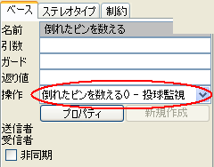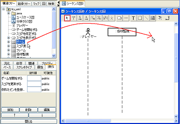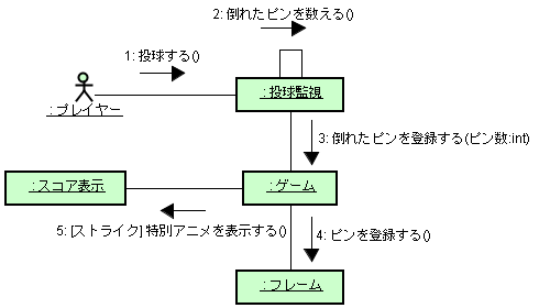 メッセージへの操作の対応付けメッセージには操作を対応付けることが可能です。 例えば、対応づけられた操作の名前がクラス図で変更されると、メッセージ名も自動的に変更されるようになります。 操作を対応付ける方法は、メッセージのプロパティビューにおいて、操作の項目で操作を選択するだけです。 今作成したメッセージに"倒れたピンを数える"メッセージを対応付けましょう。 ![]() メッセージ送信先のベースクラスである"投球監視"クラスに、操作が登録されていれば、候補が表示されます。 もし、表示されていない場合は、【新規作成】ボタンを押して目的の操作を追加できます。 【プロパティ】ボタンを押すと選択されている操作のプロパティが表示されますので、名前やパラメータの変更が可能です。 常に操作を対応付ける必要はありませんが、これを利用することで図間の整合性を維持しやすくなります。 さて、今までの説明を踏まえて他のメッセージも作成してみてください。 |
