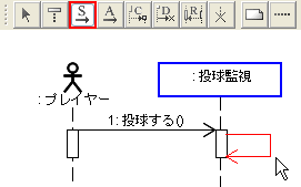 Tips:活性区間のサイズメッセージを追加したり、移動したりするとメッセージ送付元の活性区間が勝手に長くなるのに気付くと思います。 これは、送付先の活性区間よりも送付元の活性区間は長くなっているべきで、 JUDEが自動的に活性区間の長さを調整しているためです。 JUDEは自動で活性区間の長さを短くはしませんので、場合によってはユーザが長さを短くすることが可能です。 活性区間の長さの変更方法は、アクション状態などのリサイズと同様の操作で行います。 選択すると四隅にノブが表示されますから、それをドラッグすることでリサイズ可能です。 ただし、活性区間の長さの制約は、非同期メッセージについては適用されません。 |